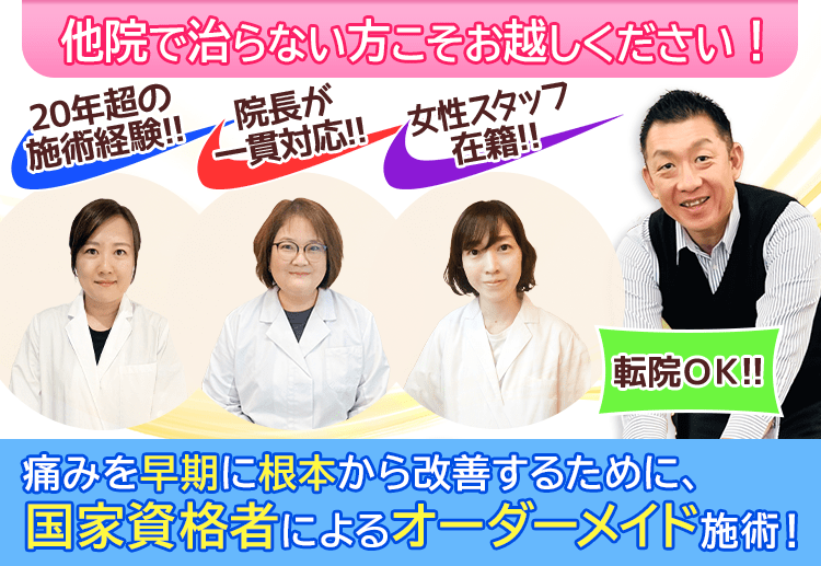 当院ではこれまでにも数多く施術を行ってまいりましたので、蓄積した知識や経験から適切な施術を判断して対応いたします。